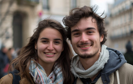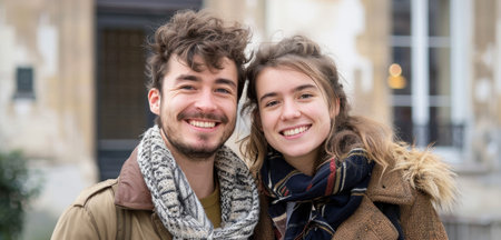 A French couple bundles up in cozy winter attire, their shared joy evident as they embrace the chilly urban atmosphere