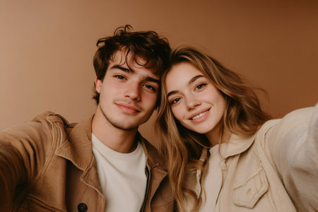 Young man and woman smiling while taking a candid selfie. Representing youth, happiness, and authentic connection