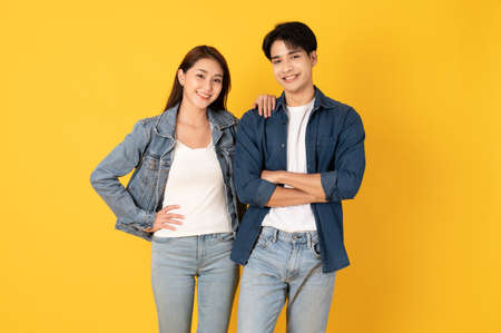 Two Young good looking asian couple using isolated on yellow background