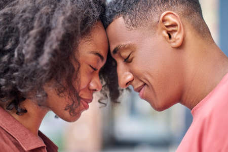 Close up profile of man and woman touching faces