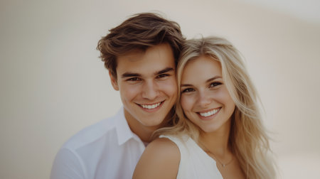 Caucasian couple posing serenely together with a minimalistic white background