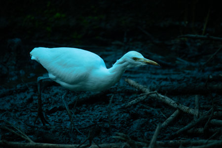 White heron feeding in a small glen next to the Itsukushima Shrine in Miyajima, Japan