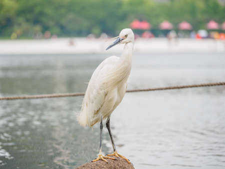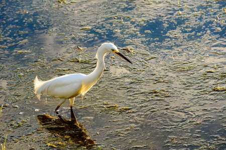 The small white heron or Little egret stands in the lake. Small White Heron, lat. Egretta garzetta, looking at fish in shallow water