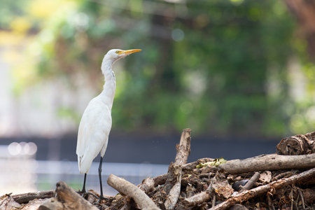 Cattle Egret is standing on a pile of wood in a city, wildlife in urban environment, India, bird in nature