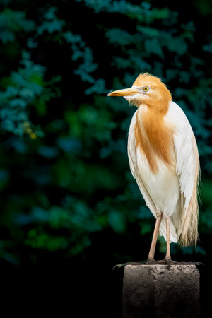 Cattle egret is a cosmopolitan heron. Bubulcus ibis with yellow plumage is indicative of breeding season. Bird rest on top tree of lake forest park in Taipei city, capital of Taiwan