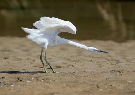 Egretta garzetta it fishes in shallow water and uses its wings to catch fish, the best photo.