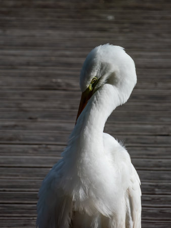 Great or common egret (Ardea alba) with pure white plumage, long neck and yellow bill standing on a wooden platform in a pond and cleaning its feathers in sunlight