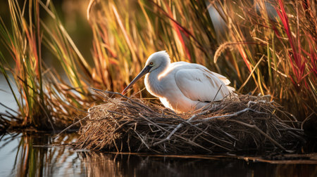 A majestic heron stands tall in a pristine wetland, its reflection shimmering in rippling waters amidst lush aquatic plants This serene wildlife photograph emphasizes the iconic beauty of nature and the importance of sustainability Discover the tranquil scene and join the movement for environmental conservation and appreciation of wildlife AI Generative