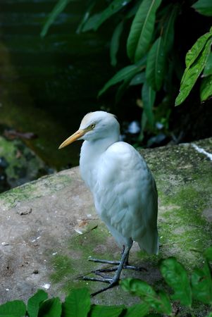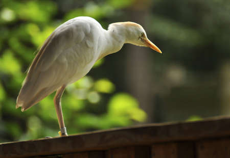 Cattle egret, a bird known to pick ticks and flies from cow's back, in captivity. Blurred background