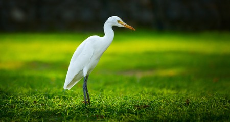 White cattle egret wild bird, also known as Bubulcus ibis walking on green lawn in summer