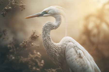Elegant great egret stands in tranquil misty water, showcasing its stunning white plumage and grace