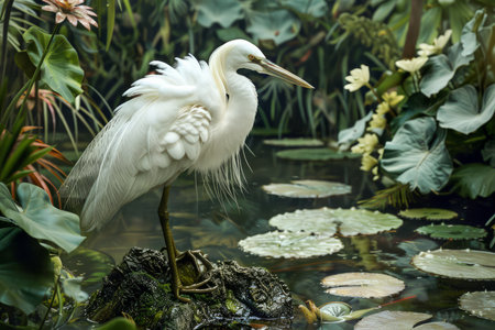 Majestic White Egret Perched on a Rock Amid Lush Pond Vegetation with Water Lilies and Foliage AI Generative