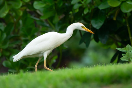 White cattle egret wild bird, also known as Bubulcus ibis, walking on green lawn at hotel yard in summer