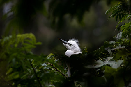 Adult bird white Egretta Garzetta on the tree with blue sky. Little egret living on the trees of lake at the Daan Forest Park in Taipei city. Taiwan