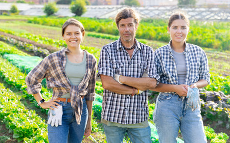 Female and man workers standing in field after harvesting at local farmers garden bed