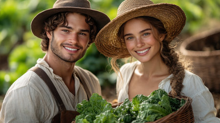 Two smiling individuals hold a basket of freshly harvested greens while standing in a vibrant farm setting.