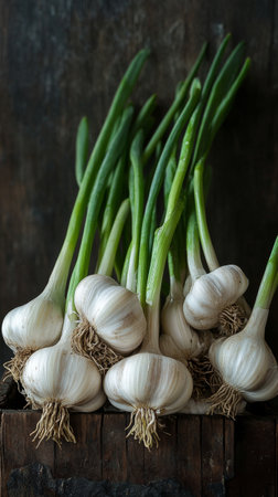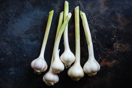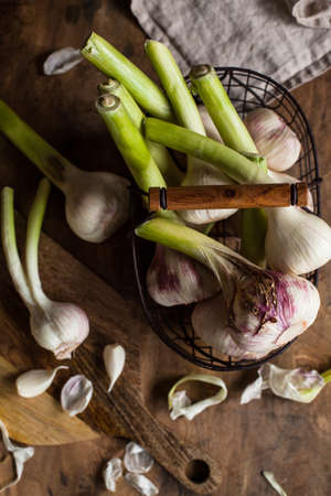 Fresh garlic bulbs with green stalks, rustic background. Harvest and organic farming concept
