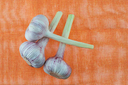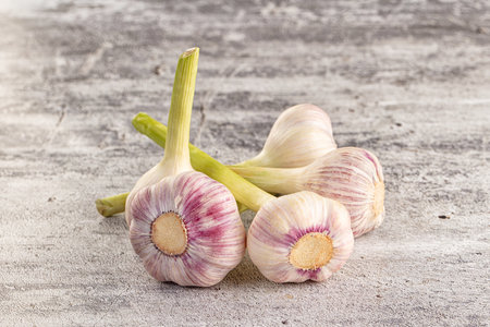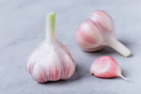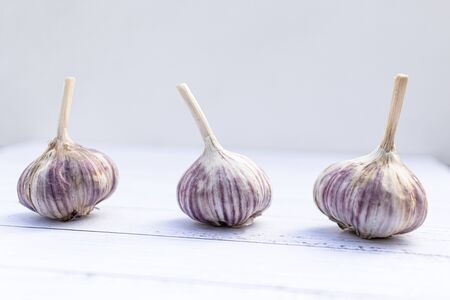fresh garlic three heads on bright background seasoning