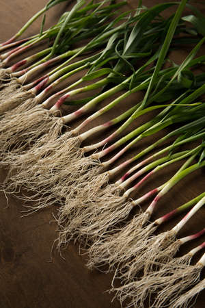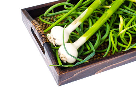Garlics stems isolated on a wooden background.