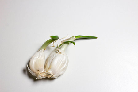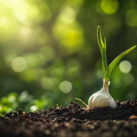 Detail shot of garlic with shoots emerging, symbolizing fresh starts, vitality, and organic resilience