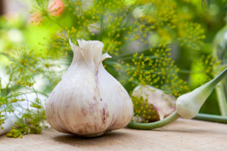 Garlic on the stone in the garden. Selective focus.