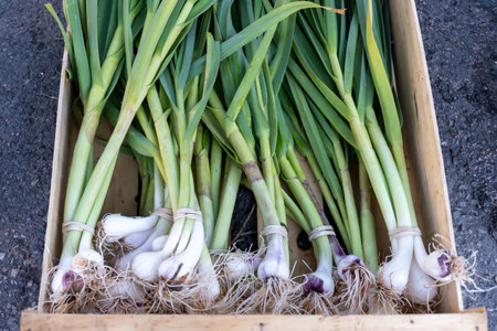 Bunches of aromatic garlic with vibrant green stalks lie ready for shoppers at a bustling autumn market.