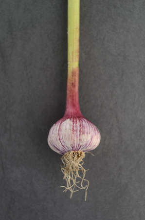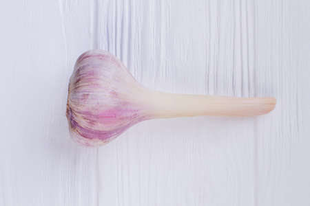 Garlic purple with stem on a white stone background. A lot of empty space.