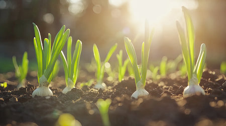 Green onion sprouts emerge from moist soil, illuminated by sunlight filtering through foliage. This vibrant growth showcases new life in a garden setting on a sunny day.