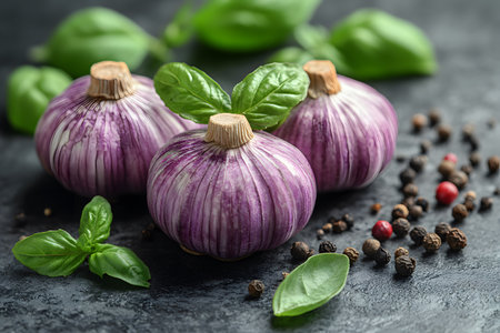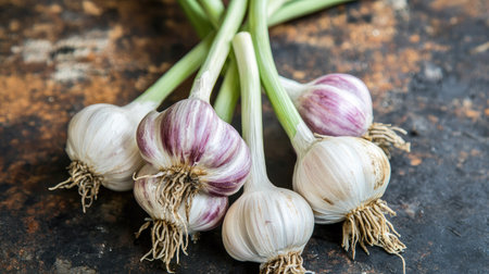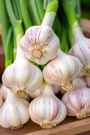Close-up of fresh organic garlic bulbs with vibrant green leaves from a local harvest