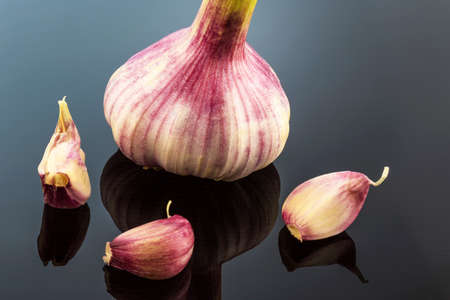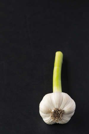 Single garlic with green leafs on black with reflection