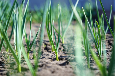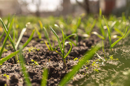 Young garlic grow on a garden bed of infield on a sunny day. selective focus