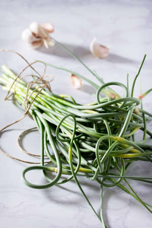 A bundle of freshly harvested garlic scapes rests on a marble countertop. The immature bulbs and long green stems create a visually appealing arrangement, ready for culinary use.