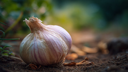 Fresh garlic bulb resting gracefully amongst vegetation in a natural setting