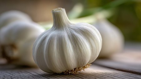 Organic garlic bulb rests gently upon aged wooden surface outdoors
