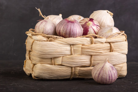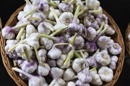 Fresh Garlic Bulbs in Wicker Basket at Market