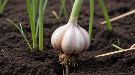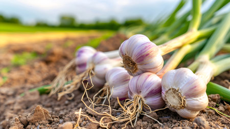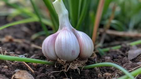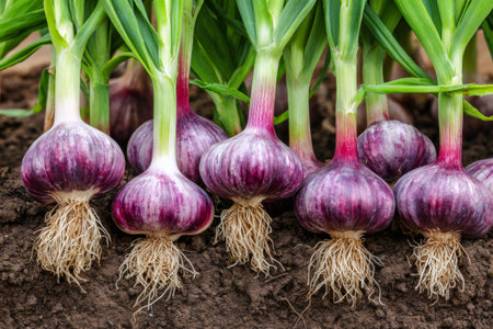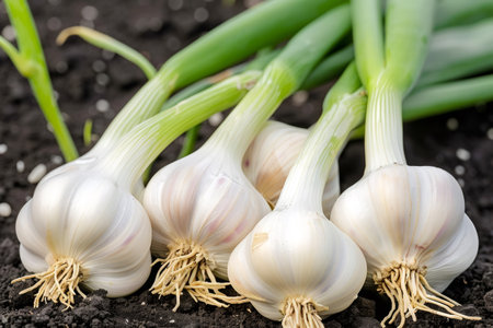 Garlic bulbs with green stems and roots growing in rich garden soil, ready for harvest