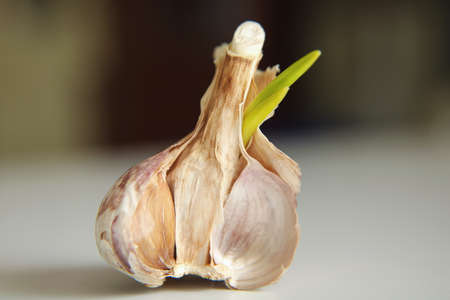 Head of garlic with fresh green sprouts close up