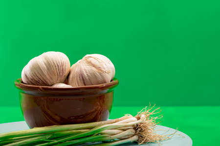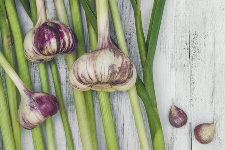 Spring young garlic bulbs on kitchen table. White background. Top view