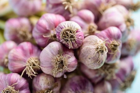 Bunches of fresh young heads of white garlic and onions on local farmers market in Dordogne, France, close up