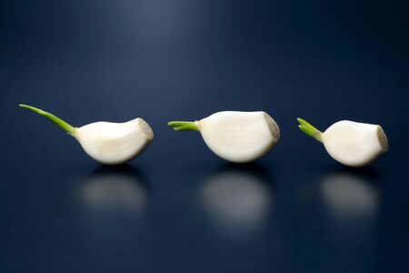 A row of sprouted garlic cloves on wooden background. Food background with copy space