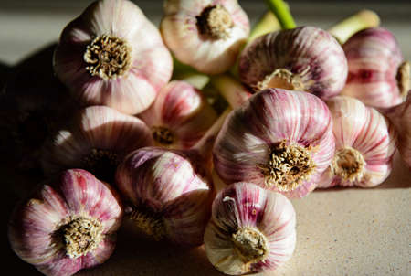 Garlic on the table. Beautiful delicious garlic. Garlic.