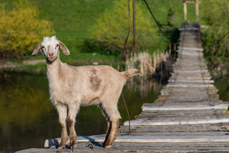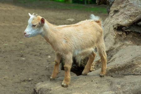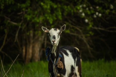 A young goat grazes in a meadow. Little goat portrait. Goat on a pasture
