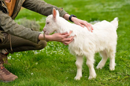 Young cute snow-white goat rests on a summer day in the village. Lamb closeup