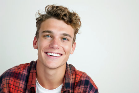 A bright and engaging studio portrait of a young white American male model, showcasing a joyful smile with perfect teeth, casual yet stylish attire