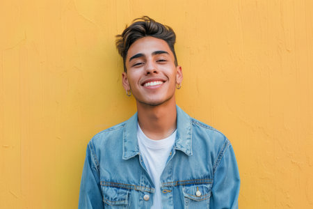 Happy cheerful young latino generation z. Smiling funny ethnic cool generation z teenage student, yellow background. Advertising of teenage cosmetics, hair care products, medicines, perfumes, cosmetology, courses, college schools and trainings