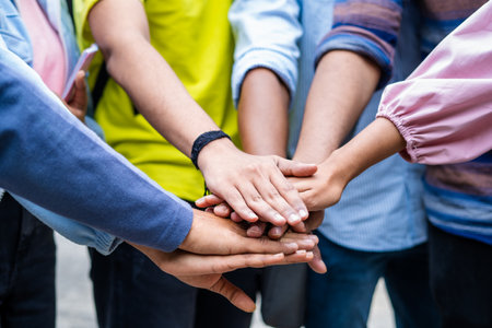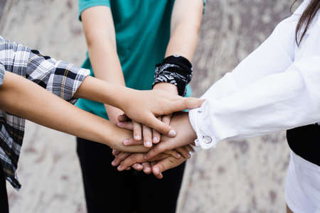 Multiracial teen friends joining hands together in cooperation