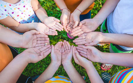 The children put their hands together. Selective focus. people.