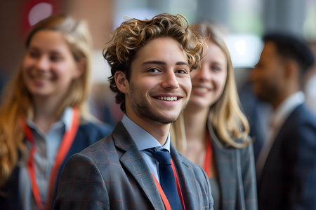 A cheerful young man stands confidently at the forefront, flanked by three friends of varying ethnicities, all sharing warm smiles. This vibrant image captures the essence of friendship and unity, showcasing the joy of togetherness among diverse individuals.
