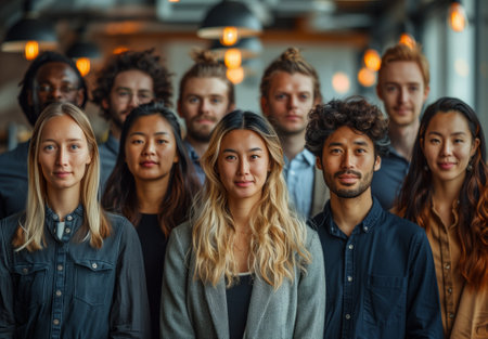 Group of a diverse professionals standing together, smiling confidently, representing teamwork and inclusion in a modern office setting.