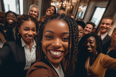 African and european girls posing with peace sign while blonde lady making selfie in conference hall Young african webdeveloper having fun with colleagues and smiling for : Generative AI